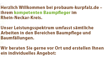 Herzlich Willkommen bei probaum-kurpfalz.de – ihrem kompetenten Baumpfleger im Rhein-Neckar-Kreis. Unser Leistungsspektrum umfasst sämtliche Arbeiten in den Bereichen Baumpflege und Baumfällungen.Wir beraten Sie gerne vor Ort und erstellen Ihnen ein individuelles Angebot: Baumpflege, Kronenpflege, Kroneneinkürzung, Kronensicherung, Baumfällungen, Komplettfällungen, Spezialfällungen mit Seilklettertechnik, Fällungen mit Arbeitsbühneneinsatz